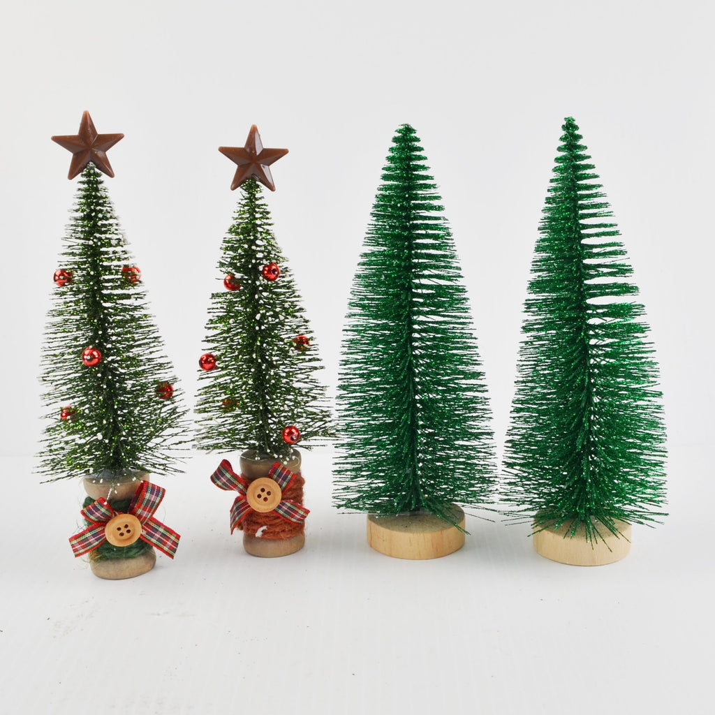 Christmas Village Bottle Brush Christmas Trees - 2 Decorated, 2 Natural, Green
