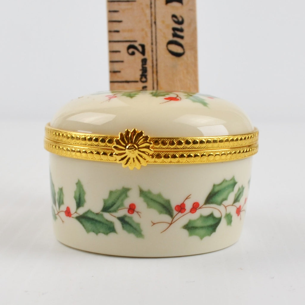 Lenox Porcelain Christmas Hinged Holly Berry Gold Trim Trinket Box 2" Diameter